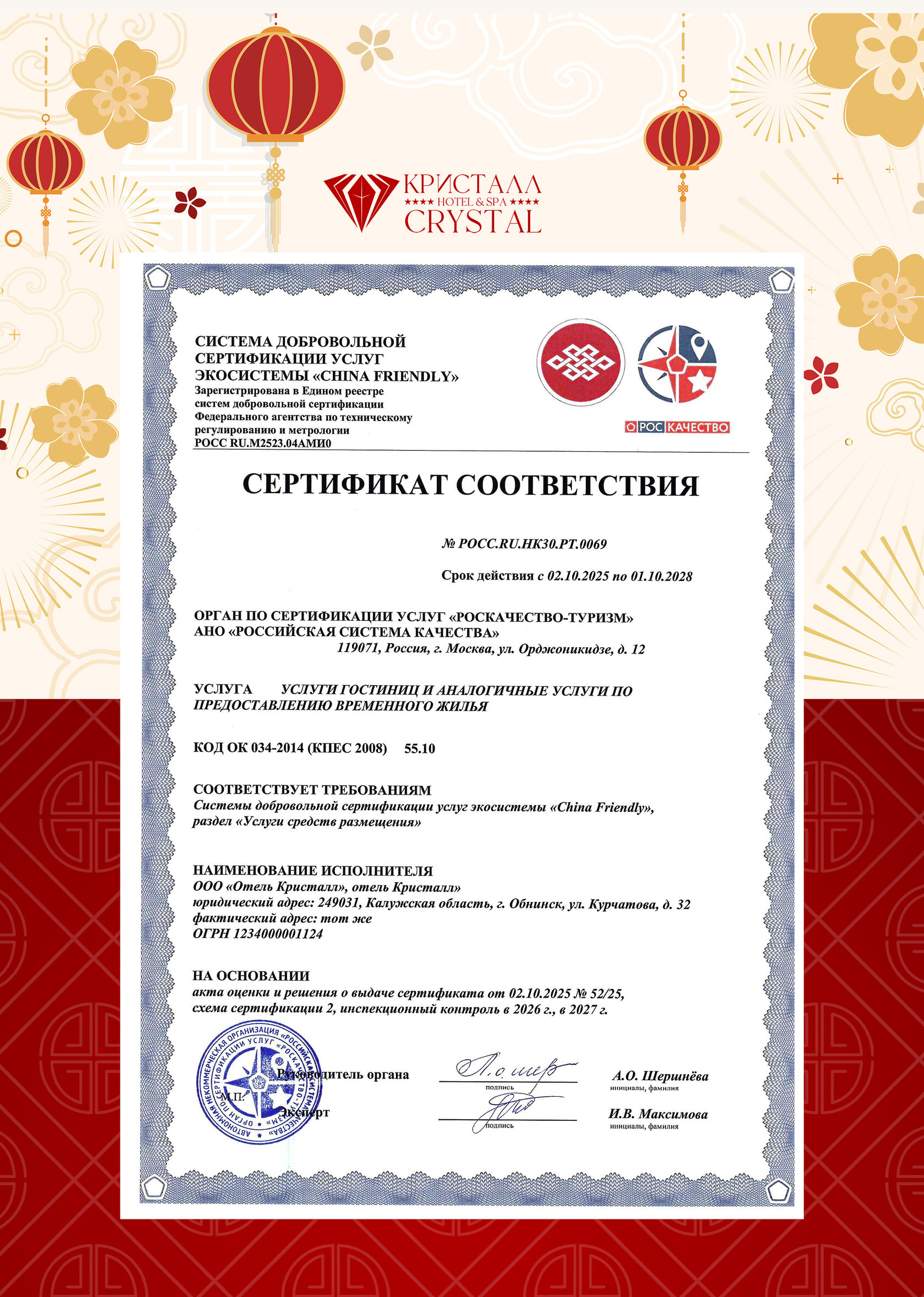 Отель «Кристалл» в Обнинске вошёл в историю туристического сектора Калужской области, став первым объектом размещения, получившим престижный сертификат China Friendly. Это значимое достижение подтверждает высокий уровень сервиса и готовность отеля принимать гостей из Китая на самом высоком уровне.